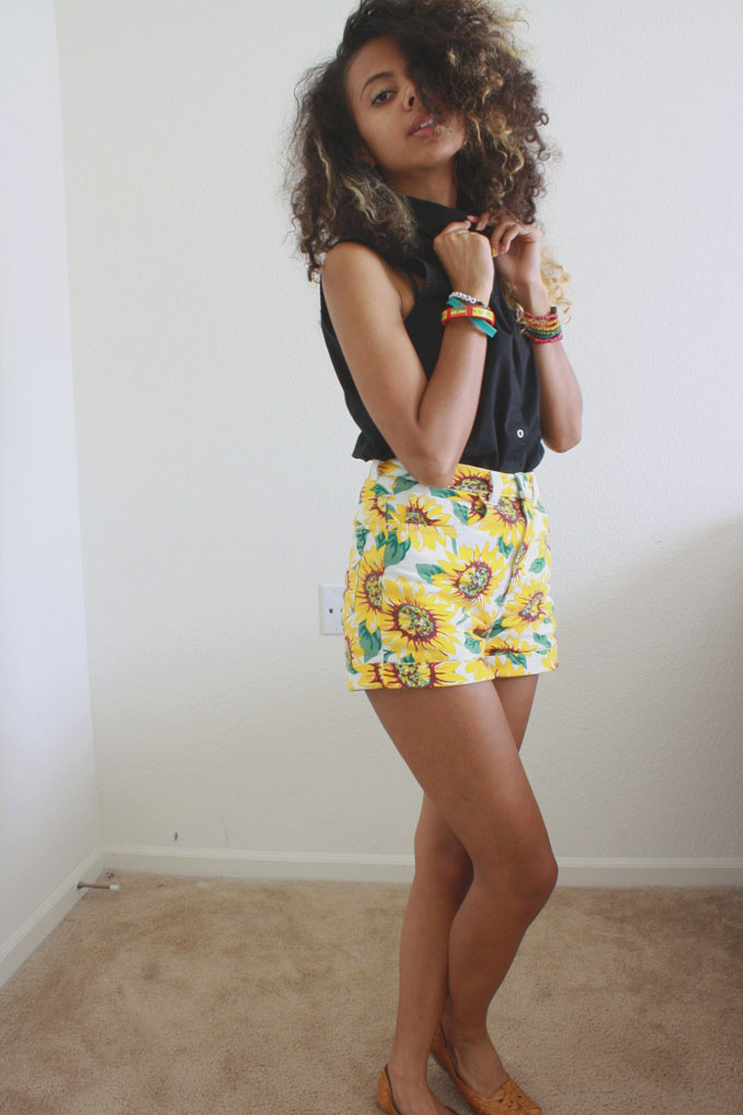 Yup, it's those damn sunflower print shorts again! I haven't worn them in awhile and I definitely want to wear the hell out of them before summer is officially over. It's already starting to get a bit chilly here... unfortunately. But I thought I'll try to wear them differently than last time and do something a bit more casual. I pieced the shorts with a plain black collar shirt to bring out the colors and my awesome (recently shurken) Levi's jean jacket!